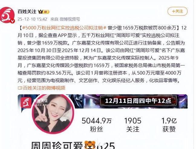 还有5000万粉丝的网红“周周珍可爱”今年9月其实控的广东某文化传媒有限公司因少缴1659万余元税款被国家税务总局佛山市税务局第一稽查局罚款829.56万余元。